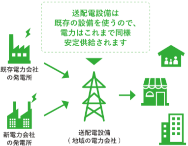 電気はこれまでと同様地域の電力会社の送配電設備を活用してお客様の元に届けられるのでこれまでと全く変わらない品質で安定した電気をお届けします。